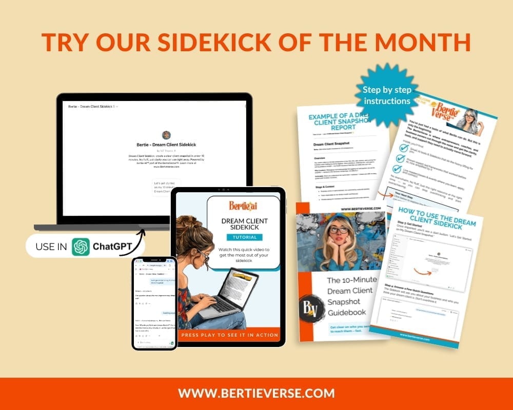 Meet your forever helpers. Each Sidekick is a single-purpose GPT you keep inside ChatGPT — no subscriptions, no fluff. Start with the free Dream Client Snapshot and see how simple it is to add a little Bertie magic to your day.