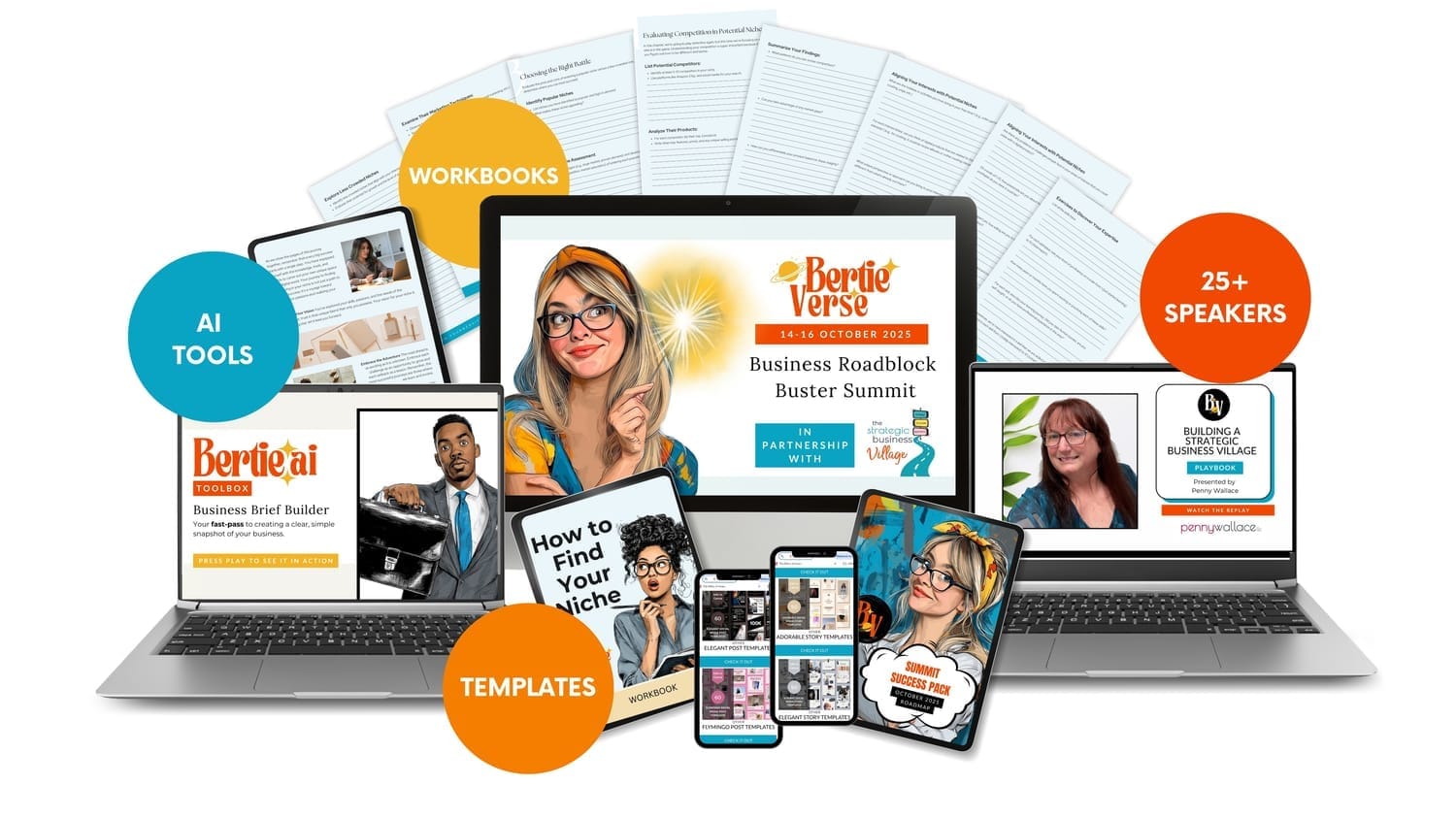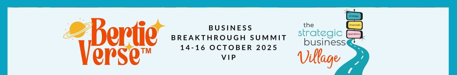 Exclusive playbooks and resources designed by Bertie to help you bust through roadblocks long after the summit ends. Think of it as your cheat codes for business clarity — practical, cheeky, and only available inside VIP.